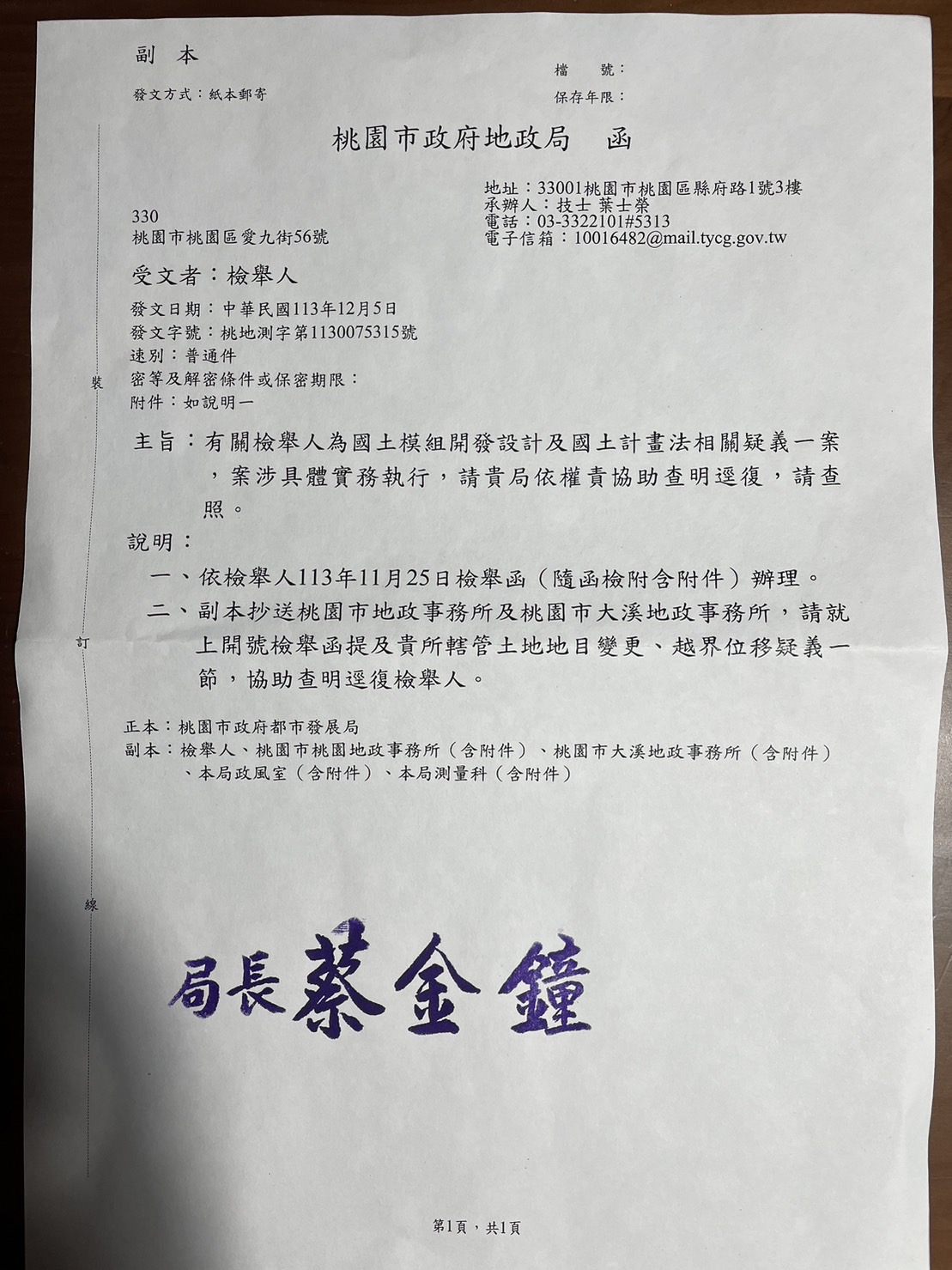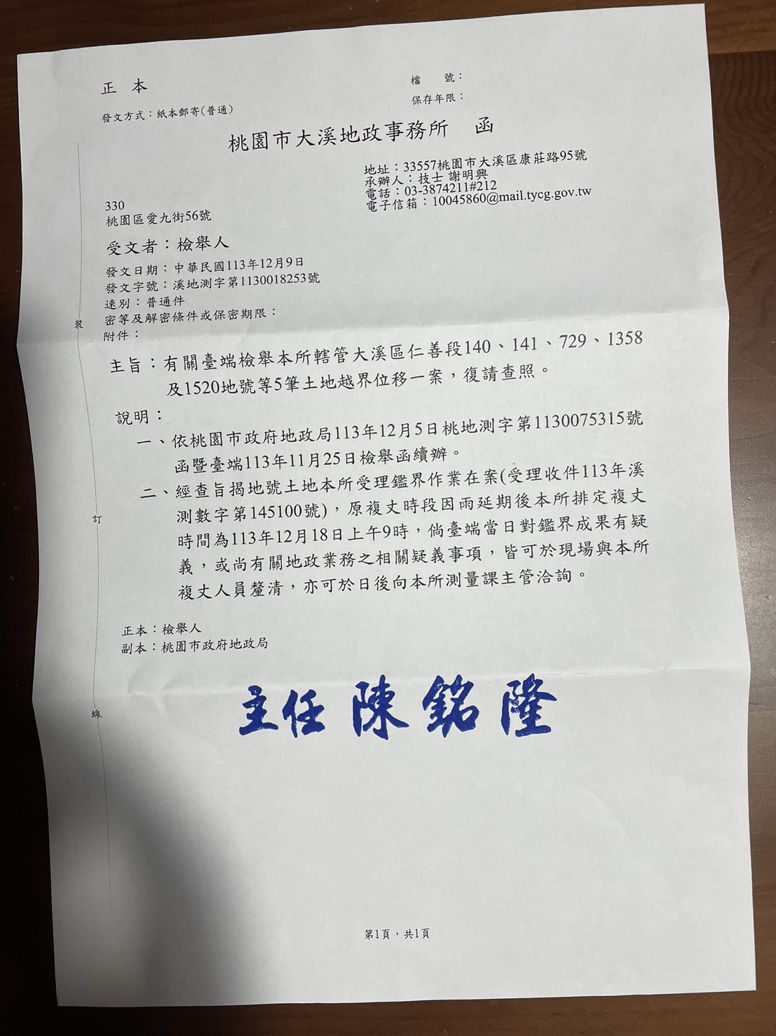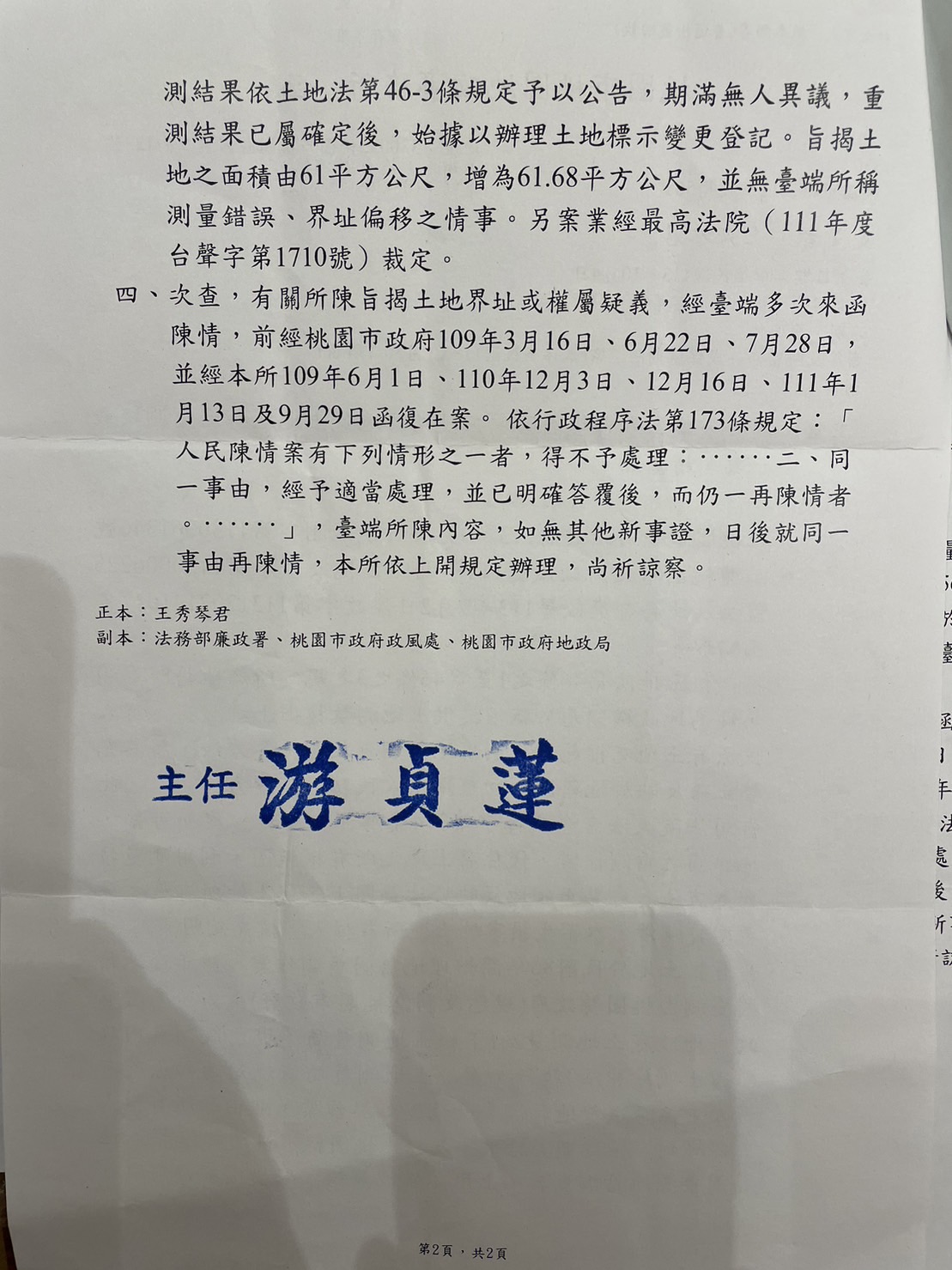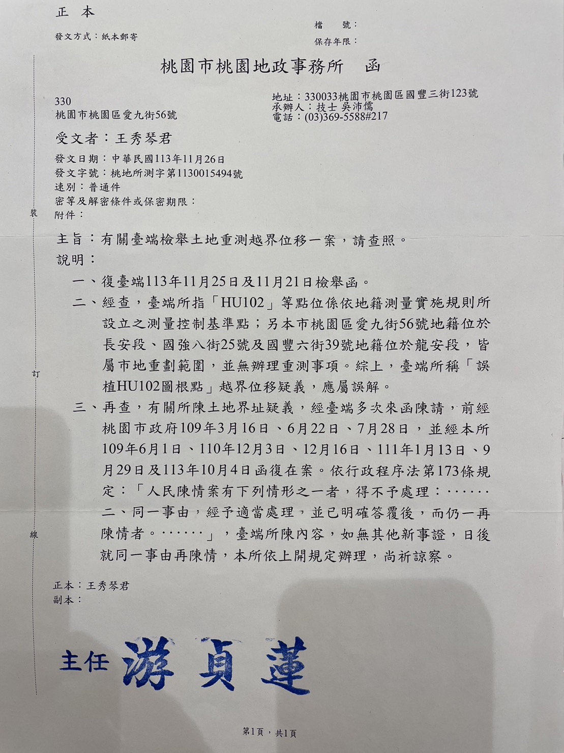 桃園市都市發展局、桃園市地政局、桃園地政事務所、大溪地政事務所⋯⋯等單位回函給我、避重就輕、推卸責任 …… 集體包庇不法集團 ….. 至今超過37年之偽造土地建物權狀、偽造貨幣、偽造文書、侵害養女生父楊庚登、養祖母陳猪母、養父王保輝三個娘家遺產繼承權、侵害我創業所得之生命財產損失慘重,十足集體違憲侵權,還不迷途知返 ….. 認錯道歉賠償 …… 繼續縱容全國各地地目變更、越界位移、山崩地裂海嘯 …… 毫無國家安全檢查、檢討、緝捕國土販毒集團公司之找回失土、徹底清查國土毒品氾濫、殘害人民生命財產之決心與行動。