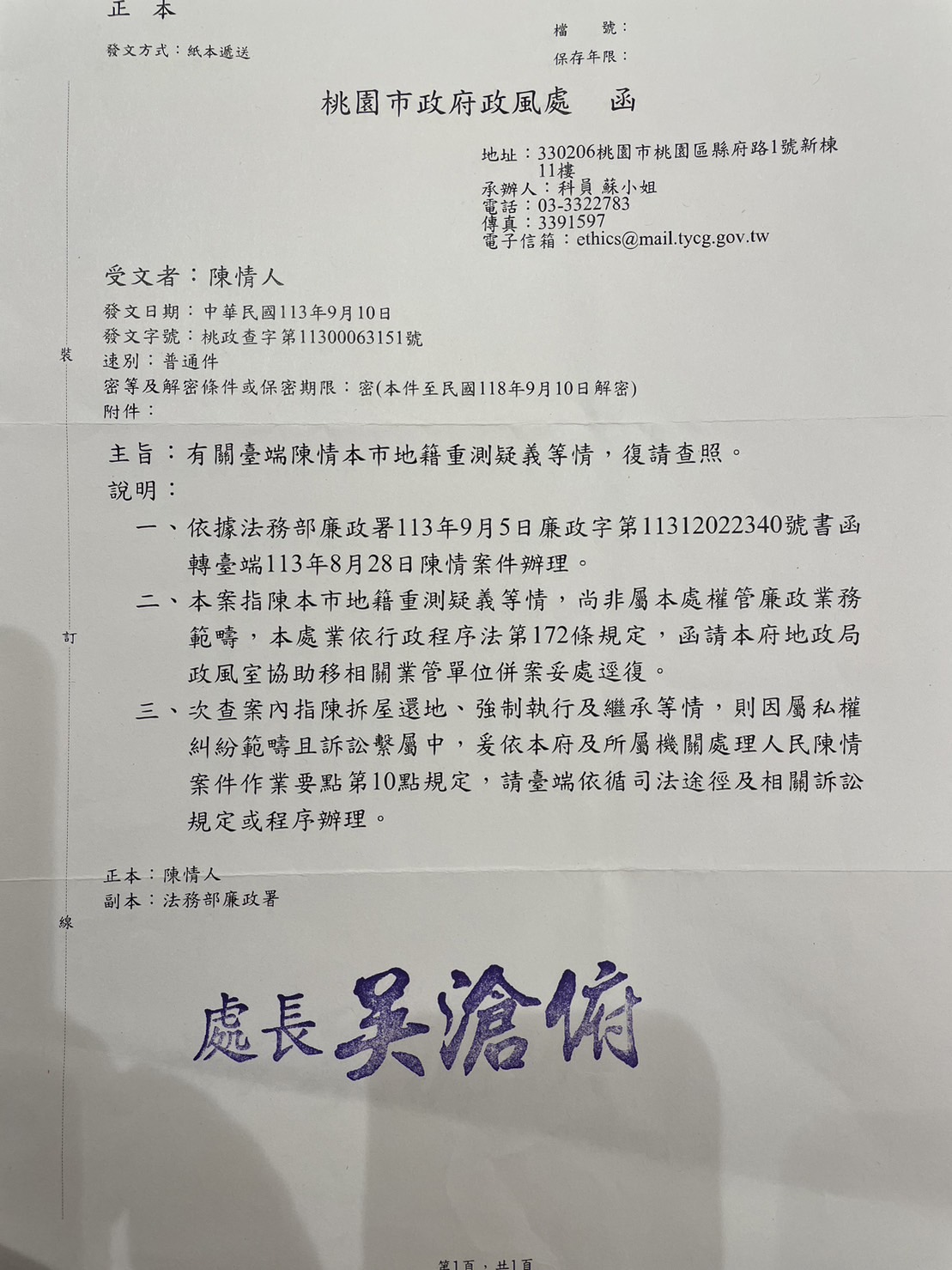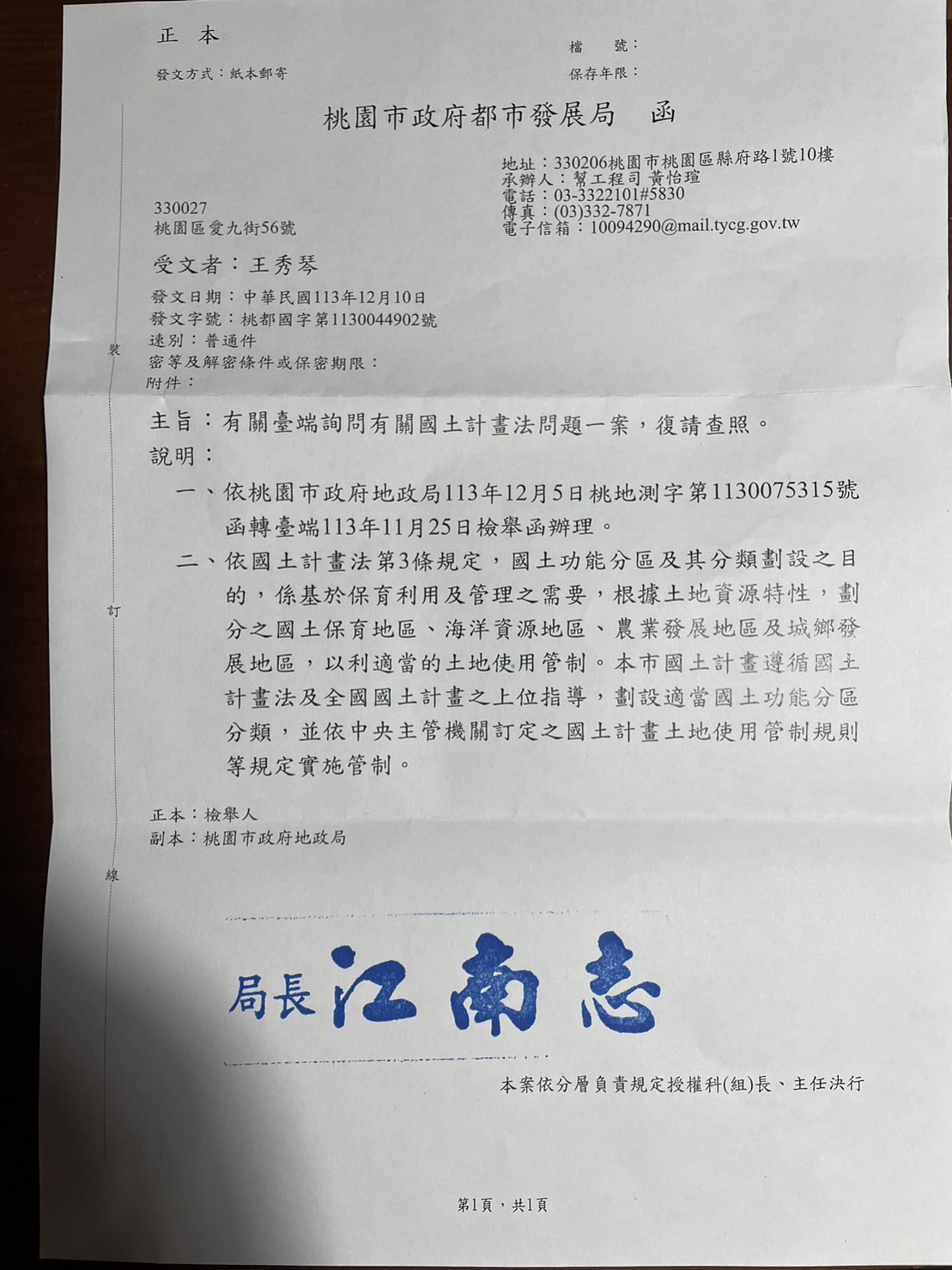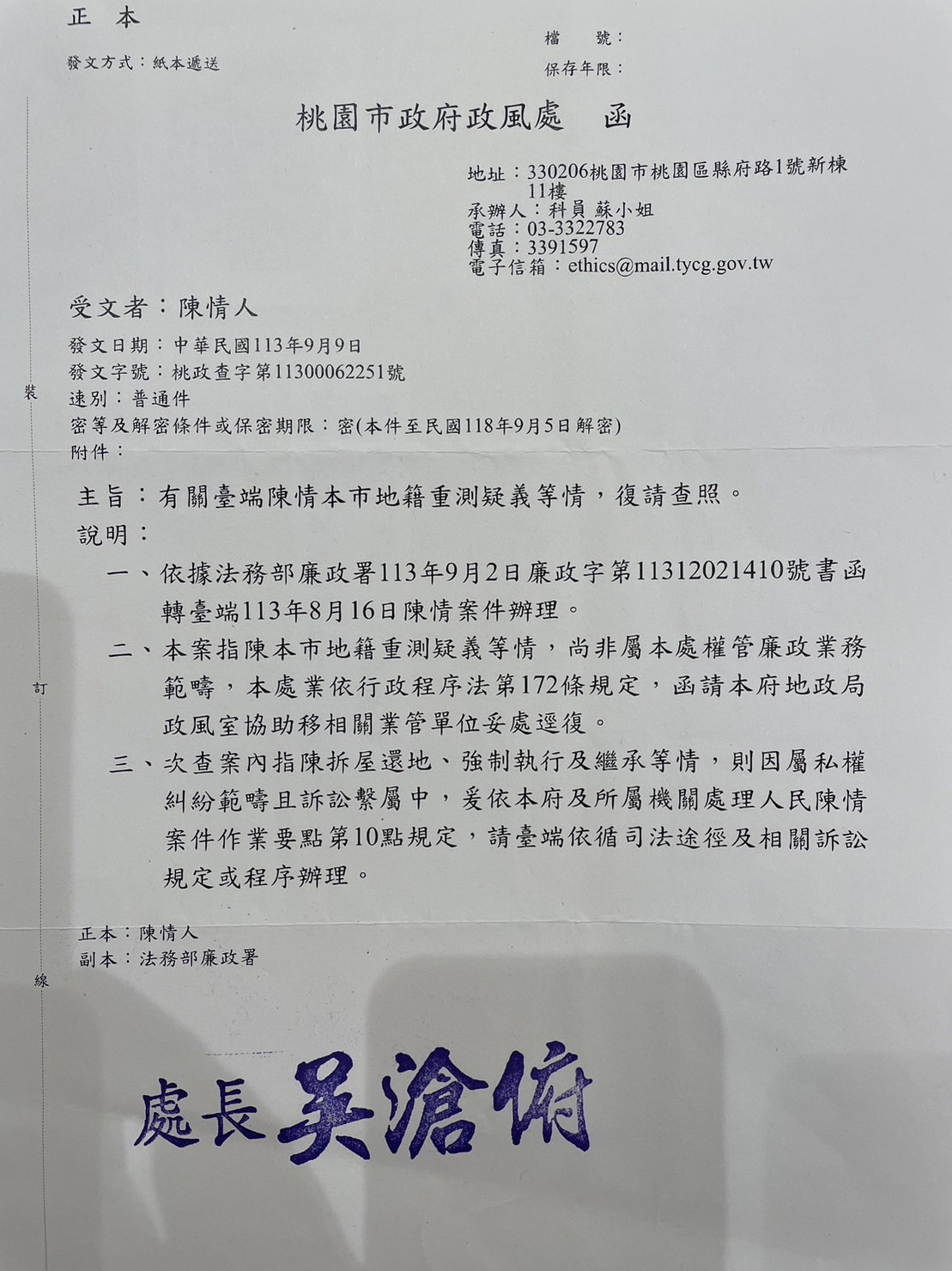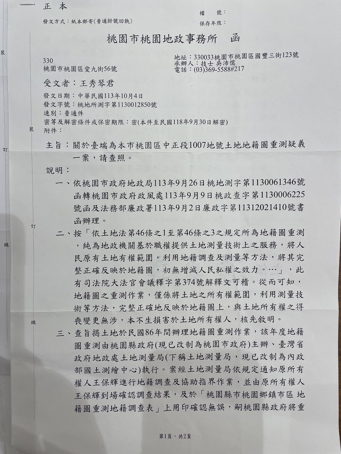 桃園市都市發展局、桃園市地政局、桃園地政事務所、大溪地政事務所⋯⋯等單位回函給我、避重就輕、推卸責任 …… 集體包庇不法集團 ….. 至今超過37年之偽造土地建物權狀、偽造貨幣、偽造文書、侵害養女生父楊庚登、養祖母陳猪母、養父王保輝三個娘家遺產繼承權、侵害我創業所得之生命財產損失慘重,十足集體違憲侵權,還不迷途知返 ….. 認錯道歉賠償 …… 繼續縱容全國各地地目變更、越界位移、山崩地裂海嘯 …… 毫無國家安全檢查、檢討、緝捕國土販毒集團公司之找回失土、徹底清查國土毒品氾濫、殘害人民生命財產之決心與行動。