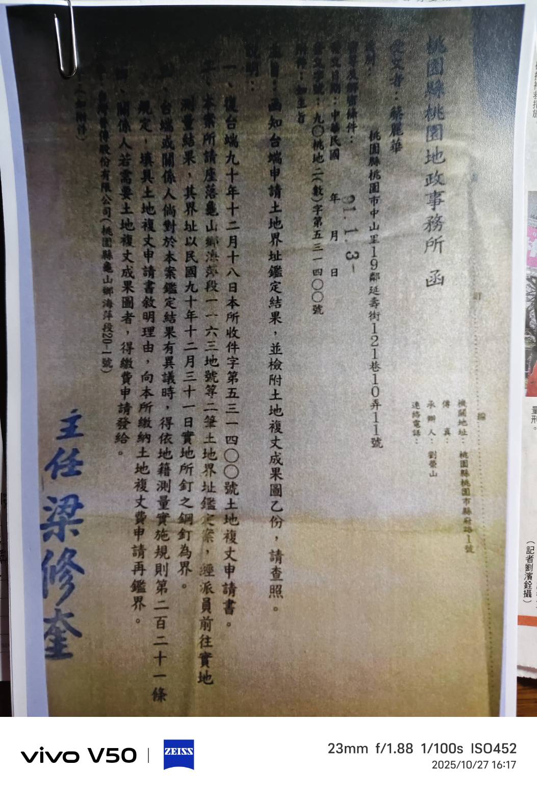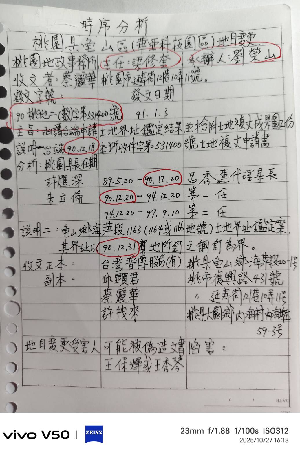 由91.01.03桃園地政事務所承辦人劉榮山、主任梁修奎 .... 寄給桃園市壽星街41號蔡麗華、許茂來、邱顯君的一封龜山鄉海萍段地目變更公文字號 ..... 自露馬腳「90桃地二(數)字第531400號」,作案手法以圖解區、數值區測量偷吃步 ..... 斷軌「掛羊頭、賣狗肉」侵害我桃園區壽星街45號 .... 複製相同模組至龜山鄉華亞科技園區海萍段 .... 變更為東嶺段,工業區 .... 過水變住宅區,侵害國土自有地主人生命財產、偽造不實繼承權 .... 國土位移犯案。