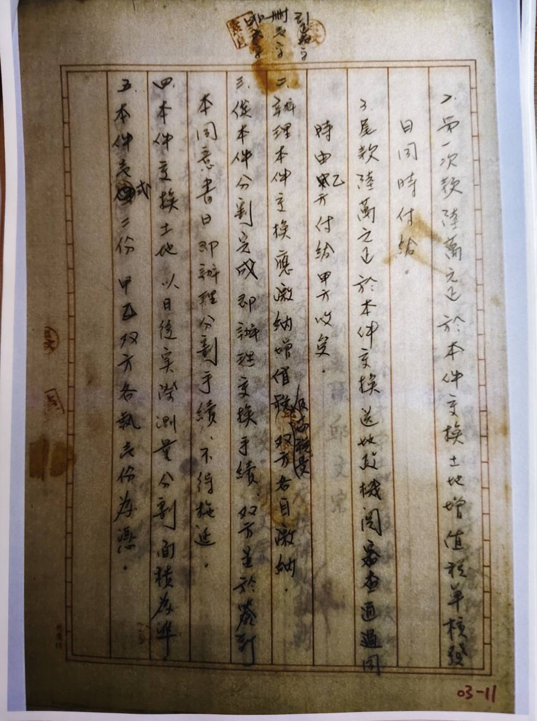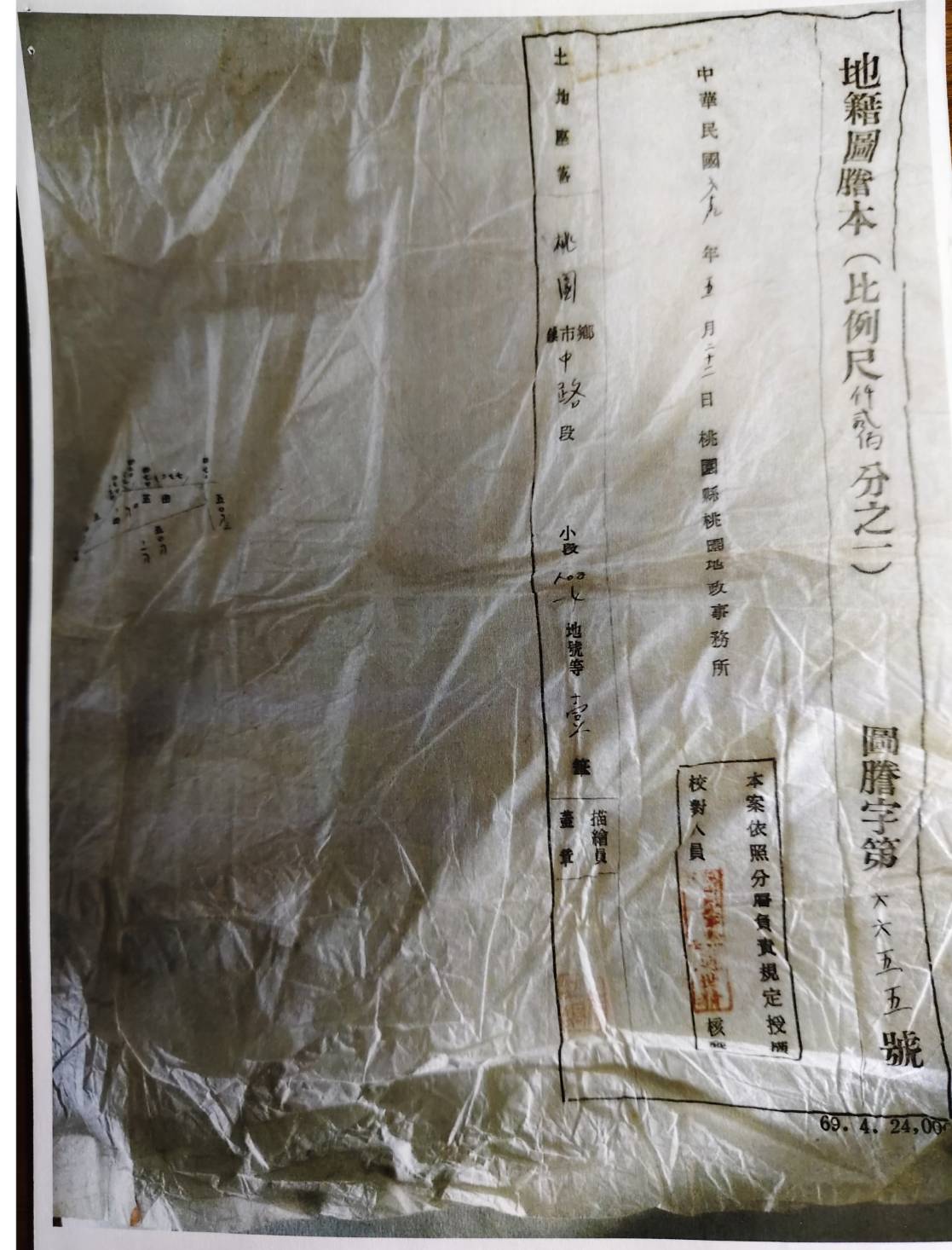 許茂來原本將這張很薄的描圖紙 ..... 桃園市中路段508-4地號歷史地籍圖謄本 .... 揉成一團丟掉,我眼明手快撿起來,懇請許茂來將這張地籍圖謄本原稿送我,許茂來太太謹慎拒絕答應,還好許茂來很大氣 .... 説土地都賣掉了,留這張紙沒有什麼用途。