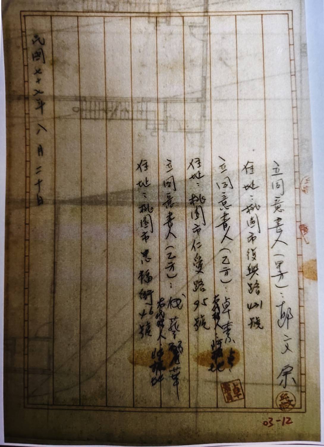 該案由鄭賜海將中路段508-4地號土地賣給蔡麗華、卓素貞,由鶯歌黃秀梅做證人。建商鄭賜海、邱建中(該名邱金城)沒有具名,實質可能涉嫌侵吞我家桃園區壽星街45號右側自有地,而將我家右側自有地偽造文書送給桃園區壽星街39號邱文宗,然後邱文宗、蔡麗華(代理人陳振地:卓素貞老公)、卓素貞簽訂土地交換同意書(可能假簽約、真侵吞我家右側自有地),完全沒有考量我家早他們15年取得時效優先權國有地之歷史事實。