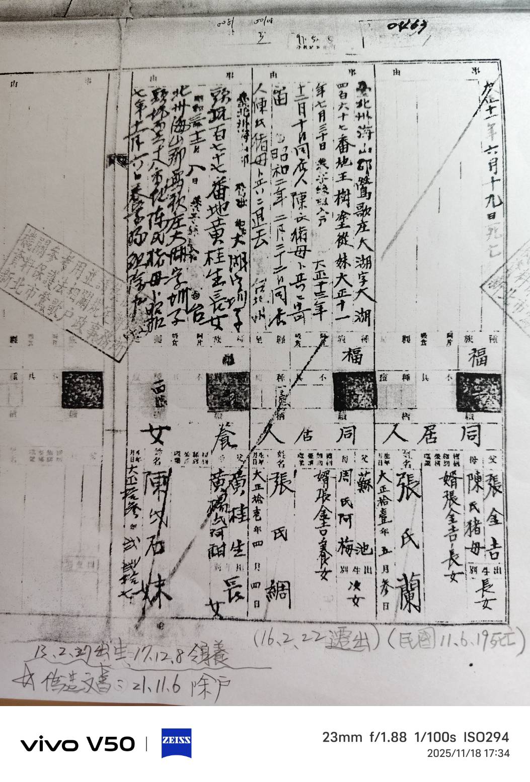 由鶯歌戶政事務所提供給桃園地院之本人養母陳石妹戶籍謄本,發現陳猪母養祖母、張金吉 民國 8.11.20結婚,民國16.03.20離婚。兩人所生女兒張氏蘭 ... 民國11.05.03出生、11.06.19死亡。